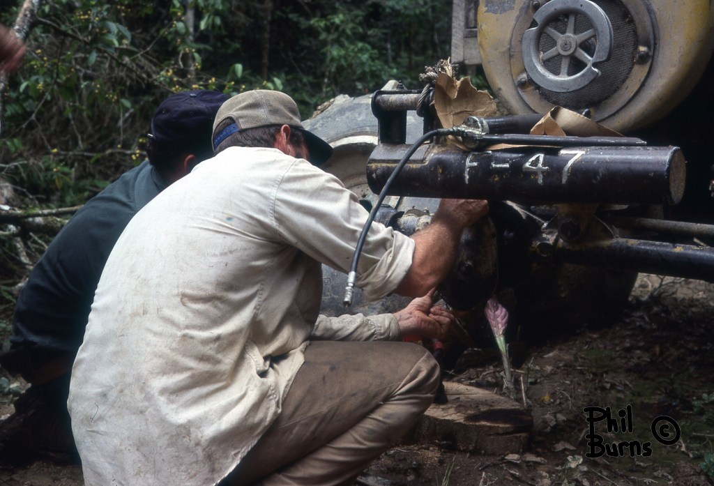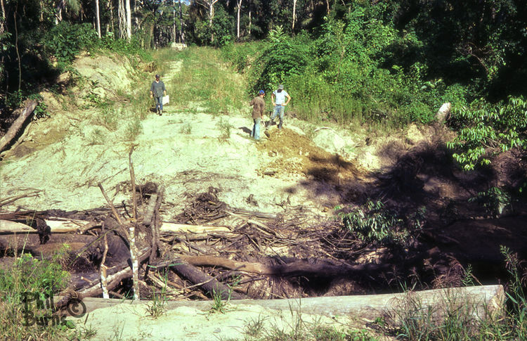 The loggers built “bridges” by filling the riverbed with horizontal logs, and then piling dirt onto those making a road on which their trucks and tractors could cross over to the other side. Rainy season and high waters, of course, had washed all the dirt away, leaving an uncrossable tangle of logs, so we would have to cut a road above or below the logs to drive the bogie down the bank, into the water, and float it across.