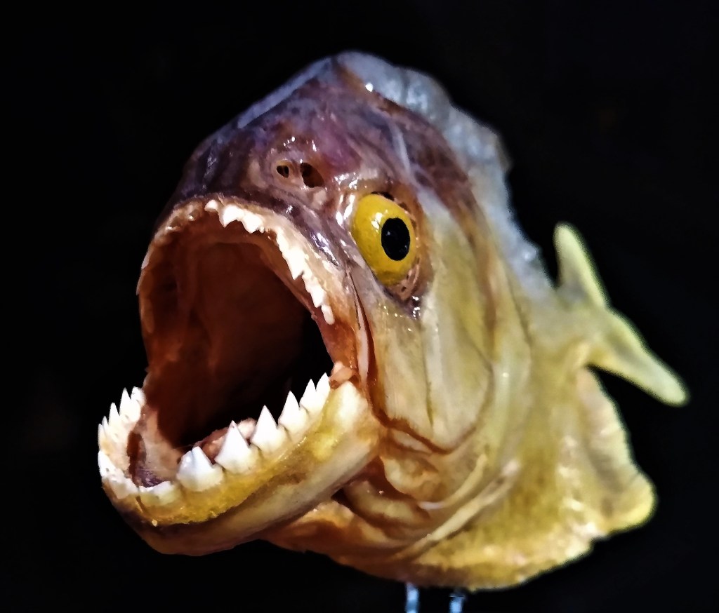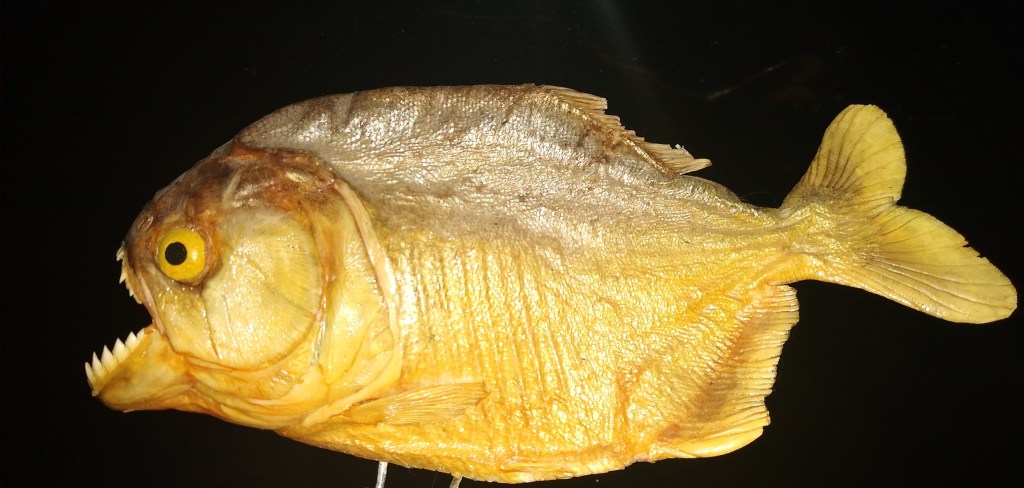 I caught a Piranha about nine inches long. I flung it as far back onto the riverbank as the short line on my makeshift jungle-stick fishing pole would allow. If the fish made a break for the river, the distance would give me a few more seconds to decide how to get my hook out of that mouth full of teeth. We didn’t have a pair of pliers and there was no way I was going to let my fingers touch that hook and twist it out of that fish! I felt lucky to even to land a piranha without a wire leader between the hook and the nylon line. A piranha’s teeth are sharp and can easily cut nylon fishing line!