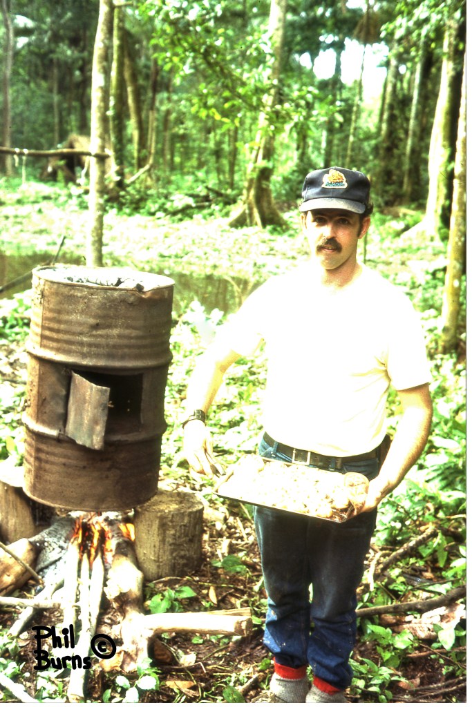 We made it back to camp, praise the Lord! Alan and Denny took off in the swamp tractor to retrieve the pig. In the meantime, the three of us drank two gallons of Refresco (Like Cool Aid) and felt somewhat revived by the time the others returned with the fresh meat. Once in camp, Denny skinned it, then it was cut up in pieces and put over a fire to smoke. We had some for supper. It was good! No rank smell or taste, either!