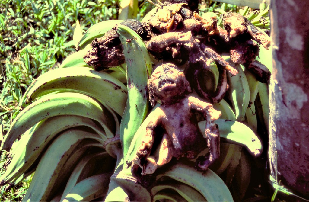 Matt and I carried the peccary and the rest of Tibaquite’s arrows and headed for home. Daniel picked up the monkeys his father had been carrying. He fell way behind us from the start. Later we waited for him and saw him picking leaves although I couldn’t imagine why. He remained behind us, so I thought the monkeys were too heavy for him, so when we were almost there, I let Matt drag the pig alone and went to lend a hand to Daniel. He had the monkeys in true Yuqui fashion dangling down his back, suspended from the vine his father had used. The vines went around his forehead so the whole weight of this burden was upon his head and neck. In his hand he carried the unborn pig fetus wrapped in jungle leaves!