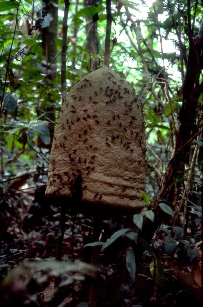 No sooner had I commenced swinging my machete, a second time, than another bee was knocking on my face. It stung me on the end of my nose. Then like a sewing machine gone berserk, it sewed a seam up my nose, across my brow and over my forehead before getting caught in my hair. With multiple stings to prove it, I knew this one was definitely not a honey bee! I ran over to Matt and he grabbed it with his gloves, pulverizing it to obliteration.