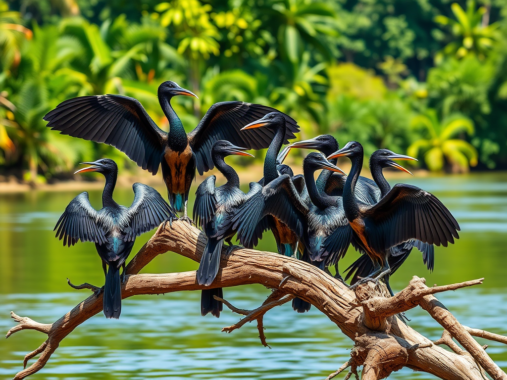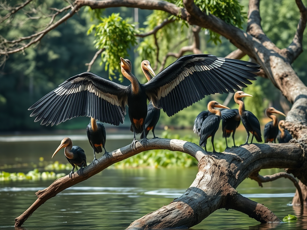 As we motored around a bend in the river, we came upon quite a sight. About sixty Snakebirds clamored for footing on the crowded branches of a fallen tree in the river. The birds held their sodden wings in full open position, long black flight feathers hung, like socks on a clothesline, to dry in the sun. I wished I brought my camera!