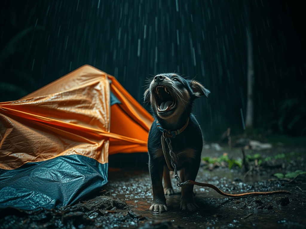 I hurriedly repacked my pack, and stuffed my sleeping bag into it’s cover. Lastly, I donned my plastic poncho. As I crawled through the tent door the first drops of rain started to fall. I crammed my gear under the frame of a truck on a flat railcar hoping it would stay dry. Then, I tied Boris and Tasha to the train car where they could huddle between the rails and behind the big iron wheels and, hopefully, stay dry. I went back to get Toughy when the clouds unleashed their full fury. The rain fell by the bushelful, threatening to drown anyone, man or beast, unlucky enough to be out in the falling deluge. I decided that it was every dog for himself, now!
