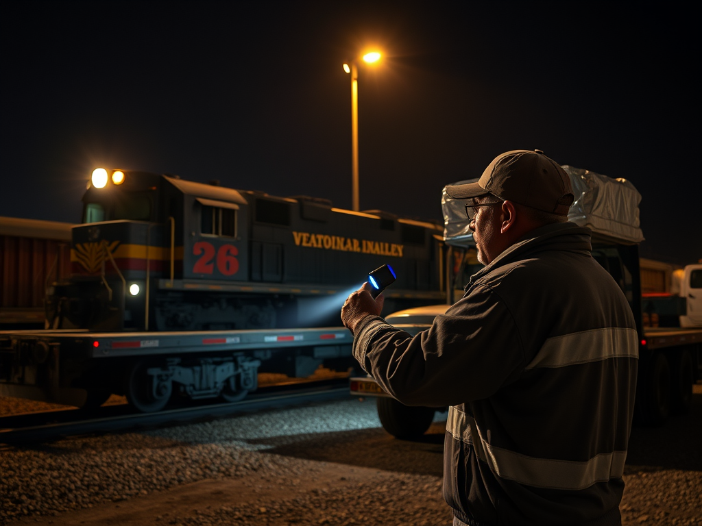 I was not taking any chances on wrong information! I doubted the men really knew the answers to my questions. Because they were traveling by truck and not by train, the railroad schedule would not be a high priority for them to know. Leaving them, I ran towards the man directing the train engine in hooking up to the flatbed that held all our stuff. He was waving his flashlight back and forth. He stopped long enough to shake my hand and say something I did not comprehend. I asked him when the train was leaving. He said that night! I told him I had stuff on the train and more stuff in the work station. I rushed away to get it, hoping he had understood me and would not let the train leave until I was all aboard. I set a world’s record in taking the tent down and packing it away.