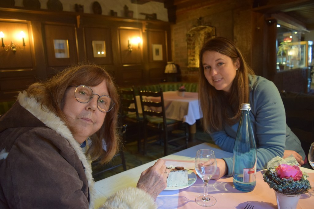 It was night when we pulled into the Airbnb that Heather rented for two nights in the city of Konstanz, across the lake from Switzerland. Our dwelling was up on third floor. The building had an elevator, so JJ had no problem getting up to our room. She doesn’t do stairs well! Our accommodations had one bedroom with a bathroom. The kitchen, dining, and living room were open concept all together in one long room. There was an entry way just inside the front door, with a place to hang our coats. Heather gave us the bed, two single beds scooted together, and she slept on the couch in the living area.