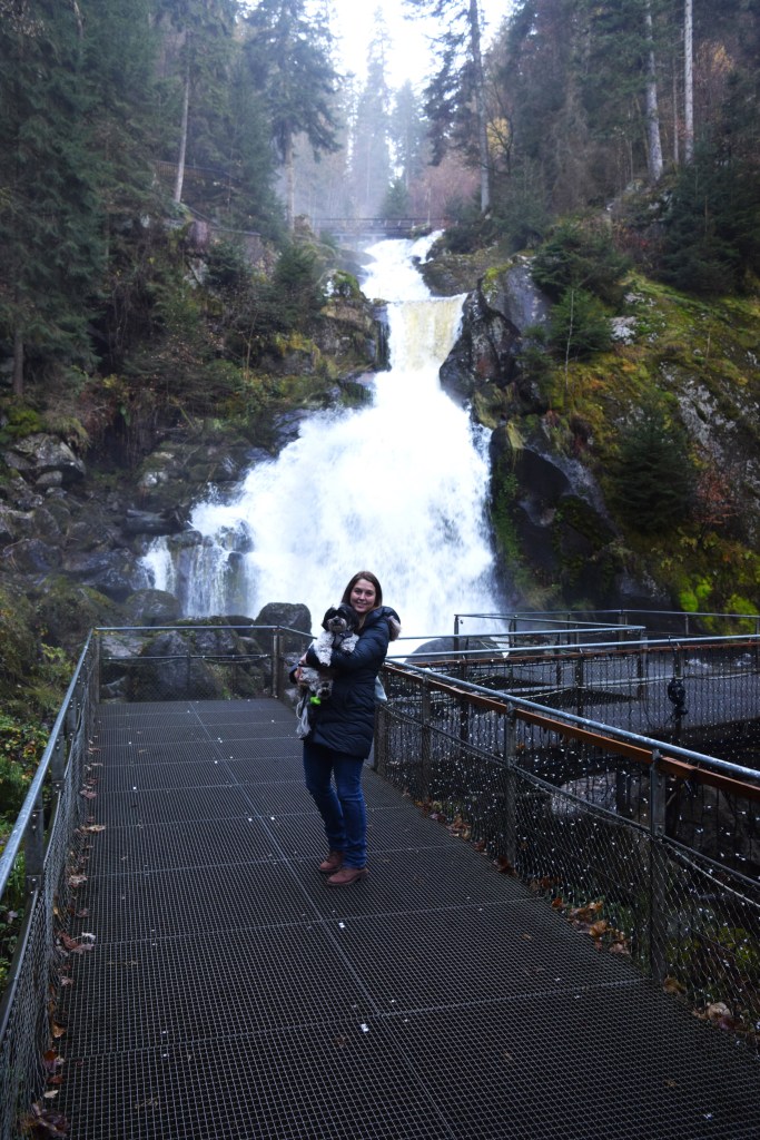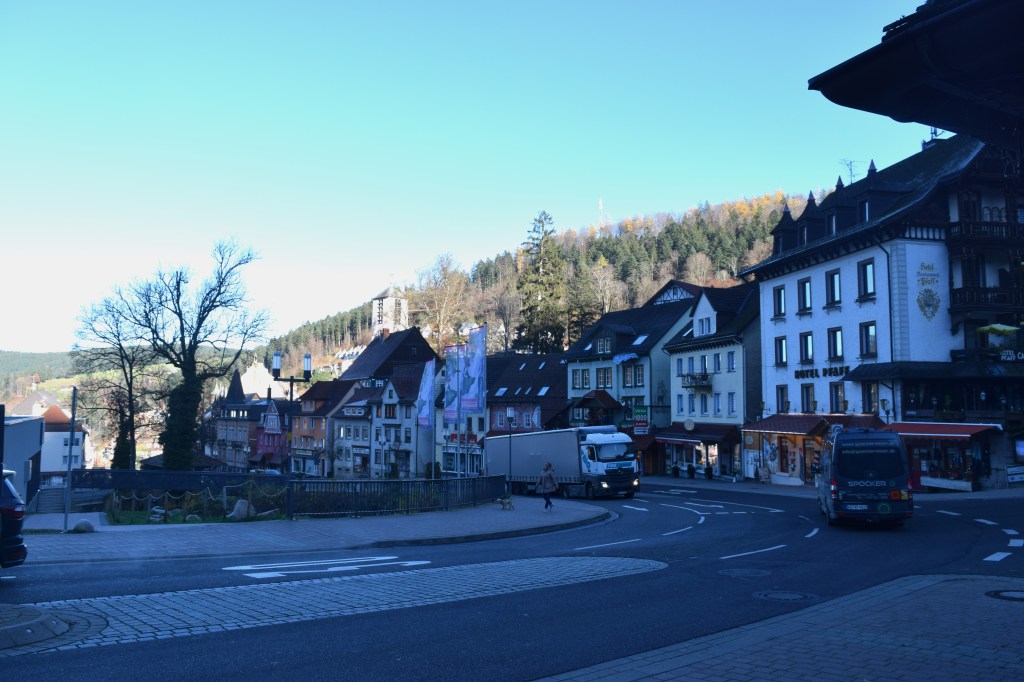 Like many towns in Europe, Triberg was setting up for their yearly Christmas market. It would be situated along the winding path we climbed to the falls. The booths were not on site, yet, but gayly colored wood cutouts were already in place on the mountainside.