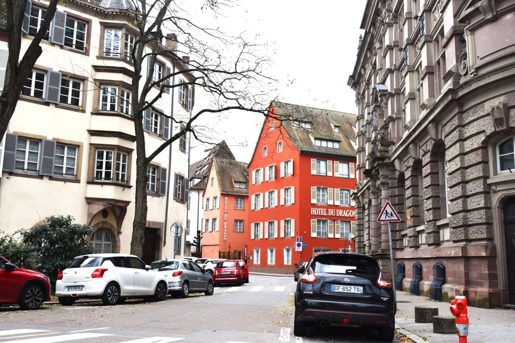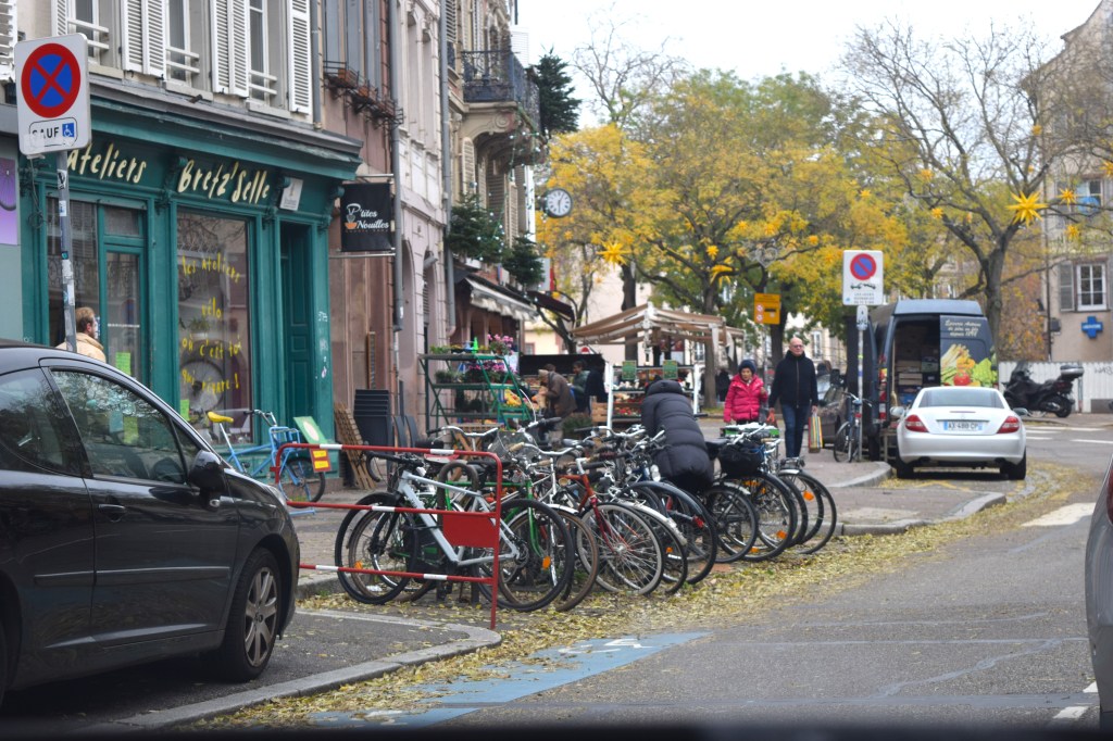 While we were stuck in traffic, I enjoyed seeing the historic city: the narrow streets, the buildings, many of them were four stories tall or more with steep roofs and dormers, the river, the cobblestones, the churches, the houses, and people on bicycles. Other than the inhabitants being dressed in today’s fashions, the city landscape resembled that in old movies with a plot set in Paris. Yes, Strasbourg lacked the iconic Eiffel Tower in the background, but in my mind, it was easy to picture allied tanks rolling over the paving stones in a WWII film about liberation of Paris.