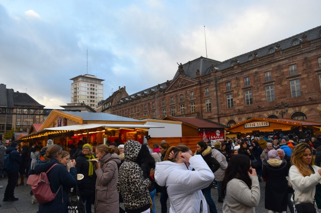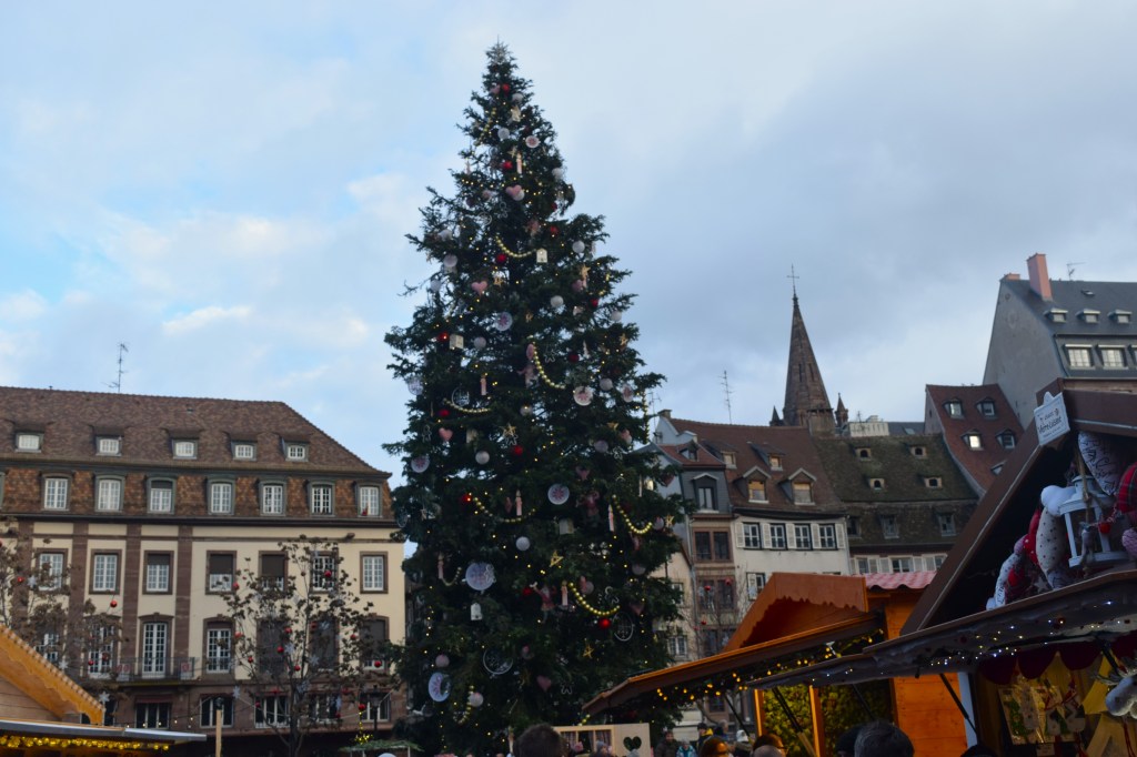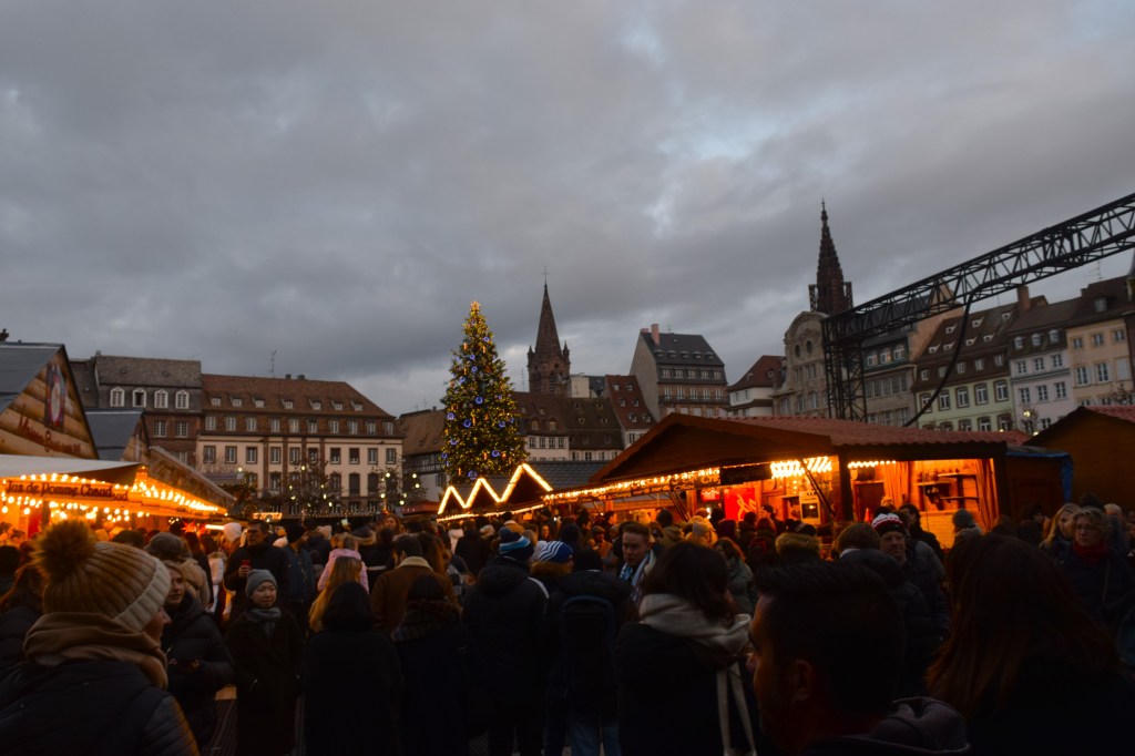 For the next three stops, I hung on to a pipe pedestal that was screwed to the floor, with one hand, and with the other, did my best to keep Jackie’s walker from swinging around and striking another passenger. Our destination reached, we left the tram and walked a block to the square, the site of the Strasbourg Christmas Market