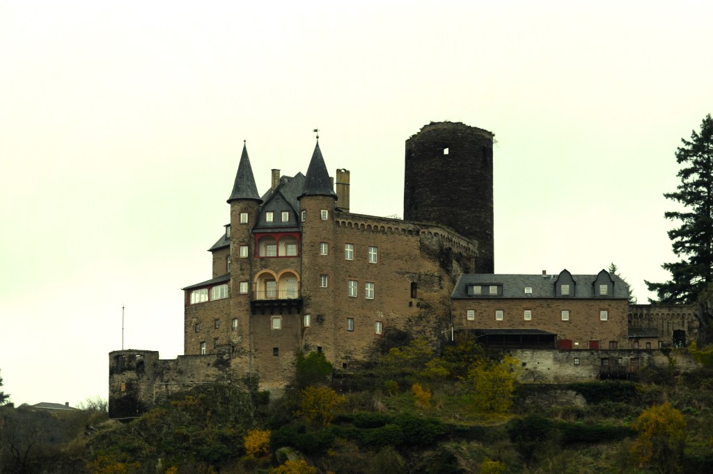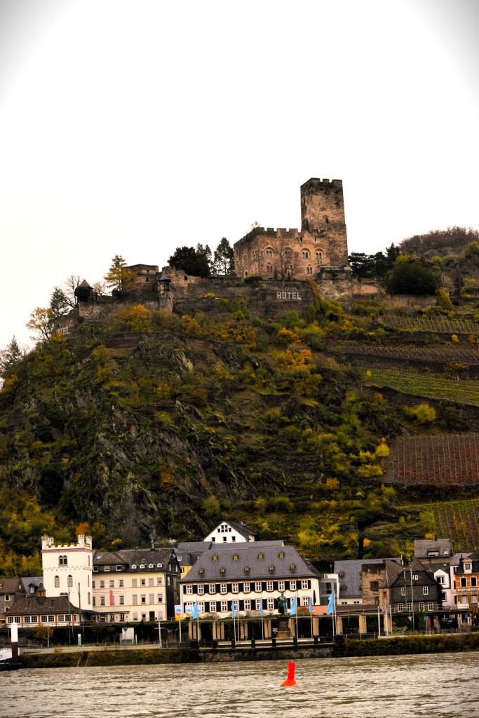 I did not realize so many castles had been built up and down the river. There were castles where people still lived, castles that had been turned into hotels for the tourist trade, and castles that were just history, ruins of walls and towers with no roofs with only a hint of their former glory. Some were perched on the mountain side with commanding views up and down the Rhine and across the landscape. Others were built close to the river on knolls that would afford good views of enemies coming by boat. We saw one that was built on a small island in the middle of the river. If nothing else, it would always have fresh water, even during a siege! The river was close to flood stage the day we were there, and the water was lapping at the stone sides of the castle. I could tell the water was high because so many trees, still with yellow fall foliage, were cooling their feet under the water.