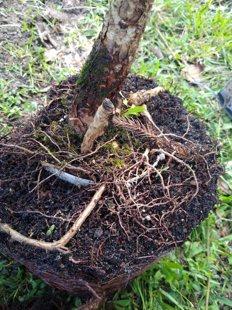 Once I cut the container off, to my dismay, I discovered the roots of the sapling were still imprisoned inside another pot. At some time in the past someone had set the tree, still in the original pot, into a second larger pot. The space between the pots was crammed full of roots. To free the root ball from that container, I had to do surgery, again, to remove the plastic prison. In the process, more damage was done to the exposed root system. I wondered if the tree would recover.