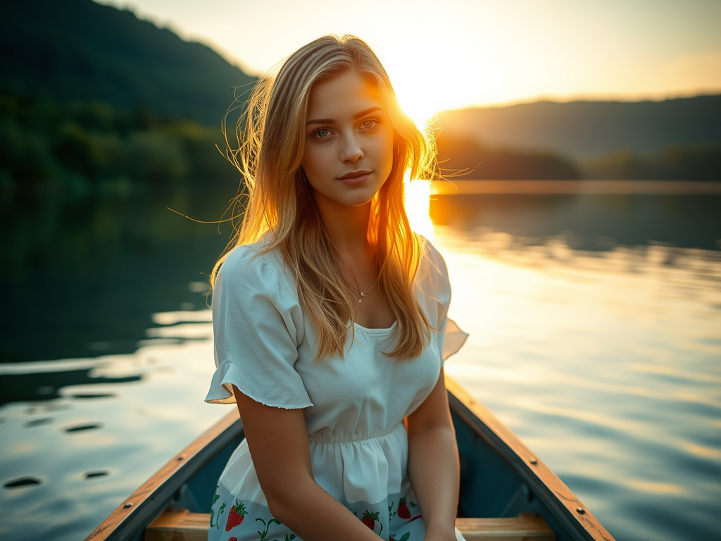 I had to crane my neck backwards to set our course. I did not mind missing the view over the bow because the view towards the stern was fantastic. Rebekah was in it! She wore a white dress with big red strawberries printed around the bottom of the skirt. I thought she was most beautiful and with the berries on her dress, she looked delicious! The fading sunlight shown through her hair turning the strands to gold. It was going to be a perfect evening!